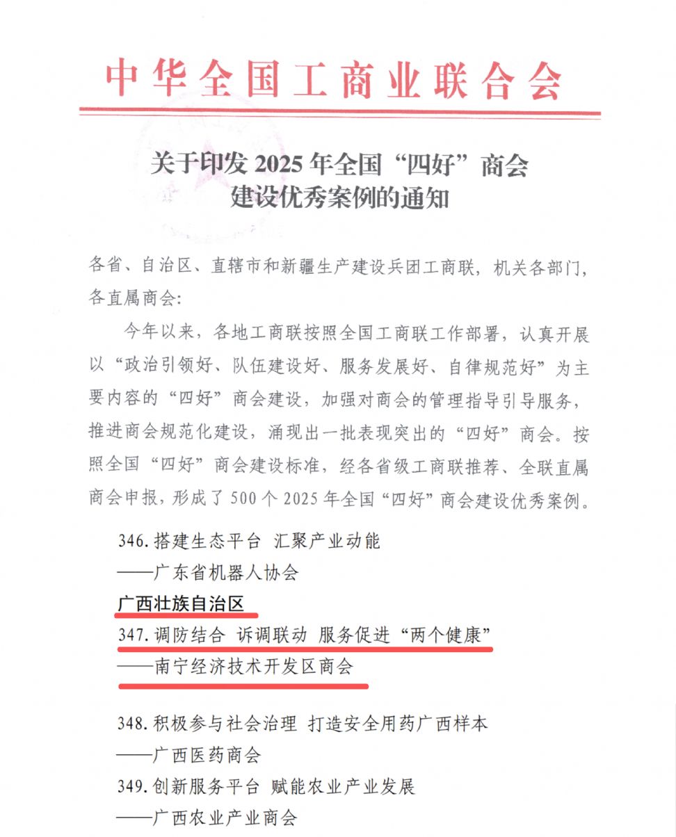 近日,全国工商联印发通知,表彰一批规范化建设表现突出的“四好”商会,南宁经济技术开发区商会获评全国“四好”商会建设优秀案例。 南宁经济技术开发区商会成立5年来,在习近平新时代中国特色社会主义思想指引下,始终坚持以“四好”标准为引领,以锻造中国特色一流商会为目标,连续5年被评为全国“四好”商会、广西“四好”商会、南宁市“四好”商会。 5年来南宁经济技术开发区商会还获得全国模范人民调解委员会、全国“四好”商会建设优秀案例、“创新中国”工商联(商会)工作最佳案例、全国工商联“百佳商会调解案例”、自治区工商联自治区司法厅“第一批全区商会人民调解组织规范化建设示范点”、全区模范商会人民调解组织、广西工商联诚信建设先行商会、全区落实“万所联万会”机制典型事例单位、全区商会和民营企业推进法治民企建设典型做法、南宁市商会人民调解工作示范单位、南宁市“万企兴万村”行动先进单位、南宁市信息工作先进单位等荣誉。 南宁经济技术开发区商会涉企纠纷调解工作经验被中央宣传部“学习强国”、全国工商联、司法部转发;党建经验、清廉民企建设经验、规范化建设经验等被国家、自治区和南宁市主流媒体广泛转发、刊载和宣传报道。2023年,全国商会调解培育培优暨“万所联万会”观摩现场会、全区工商联法律服务观摩现场会、南宁市清廉民企建设工作现场推进会等3个现场会在南宁经济技术开发区商会召开,全国工商联给予商会“做法实、有创新、亮点多”的高度评价。(来源:南宁经济技术开发区商会) (编辑:韦吉) |