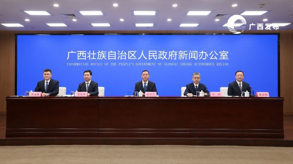 自治区政府新闻办在广西新闻中心举行“高质量完成‘十四五’规划”系列主题第一场新闻发布会。 图片来源:广西云客户端 (本网讯 韦吉)2021—2024年,贺州GDP年均增长6.2%,高于全区平均增速1.5个百分点。今年上半年GDP增长7.2%,增速排全区第2位。记者从8月26日自治区政府新闻办在广西新闻中心举行的“高质量完成‘十四五’规划”系列主题第一场新闻发布会上了解到,“十四五”以来,贺州深入贯彻落实中央、自治区决策部署,按照自治区印发《关于支持高质量建设广西东融先行示范区(贺州)的指导意见》要求,聚焦“交通扩能、产业振兴、创新驱动、环境优化、绿色发展、人文交流”六个方面奋力攻坚,持续强化与大湾区的产业协同、创新协同、开放协同,努力在深化开放合作中探索贺州模式。