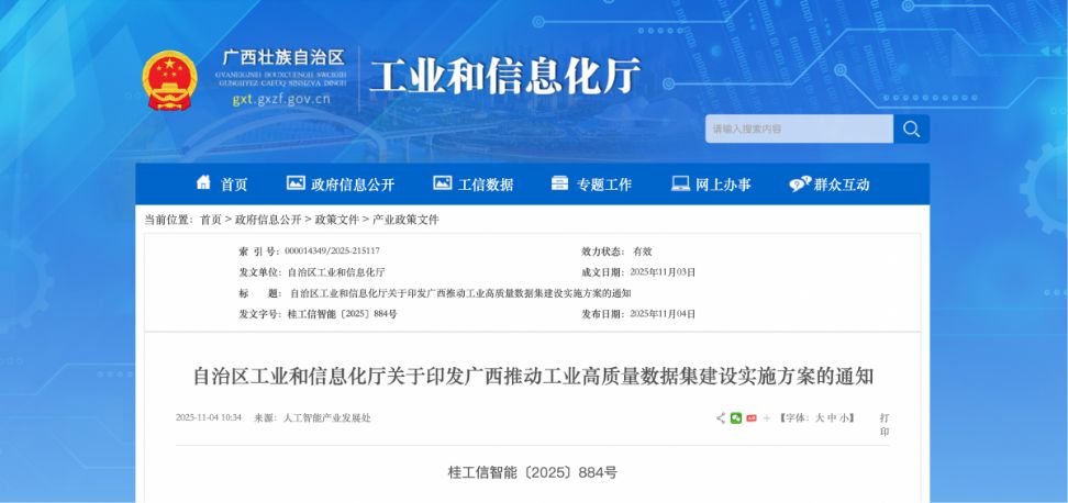 原标题: 我区加快推动工业高质量数据集建设 力争到2028年,基本建成工业数据产业生态体系 近日,自治区工业和信息化厅印发《广西推动工业高质量数据集建设实施方案》。未来三年,广西将通过梳理数据集应用需求、汇聚高质量数据、分级构建高质量数据集、分类开发数据产品、推动工业数据流通交易、加强工业数据集生态建设等六大重点任务,全面提升工业数据开发开放和流通使用水平。力争到2028年,建成工业高质量数据集100个,应用数据集打造一批行业模型,打造标杆应用场景100个以上,培育一批数据服务企业,建设数据标注和合成基地10个,基本建成创新驱动、流通高效、面向东盟、安全合规的工业数据产业生态体系。 ![]() 广西壮族自治区工业和信息化厅官网截图 据悉,广西将聚焦糖、有色金属、汽车、机械装备、石化化工、冶金、高端绿色家居、纺织服装等广西重点特色优势产业,以场景和问题为导向,系统梳理各行业的数据集应用需求,并系统性地汇聚企业在研发、生产、管理、运维等关键环节的数据资源。同时,根据企业数字化水平分级施策,从提升数据采集能力到系统性数据治理,逐步推动高质量数据集构建。 针对数据产品的开发,广西将聚焦特色优势产业,围绕龙头企业、平台企业、产业集群三种主体,分类开发形成专用类高质量数据集以及行业通用类、通识类数据集,以支撑行业、垂类、通用模型开发。 为推动工业数据流通交易,广西将搭建全区工业高质量数据集管理与供需对接平台,举办重点行业数据集应用供需对接会,以及通过创新供给模式和完善激励机制,促进工业数据集的流通交易与金融赋能。 在工业数据集生态建设方面,广西将通过引育工业数据优质企业、强化技术创新应用、健全工业数据标准规范、深化东盟合作及强化安全保障,构建繁荣的工业数据产业生态。 此外,广西将强化财政、金融、人才、土地等保障,对建设工业高质量数据集、应用数据集打造应用场景项目进行补助。支持数据服务企业申报认定国家重点软件企业、专精特新企业等,加大人工智能和工业数据领域人才引进培养力度。持续筑牢人工智能赋能新型工业化数据根基,不断壮大广西人工智能产业。(来源:广西云-广西日报 记者 梁菁惠) (编辑:韦吉) |
