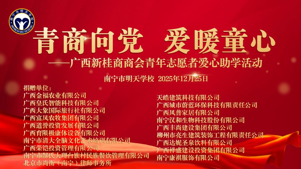 以温暖相约,以成长作答——广西新桂商商会开展“青商向党 爱暖童心”爱心助学活动 2025年12月25日,在南宁市明天学校,广西新桂商商会青年企业家组成的青年志愿者服务队开展了一场别开生面的“青商向党 爱暖童心”爱心助学活动。此次活动,商会企业家为孩子们准备了价值2万多元的运动服、纯牛奶、文具乐器、运动器械、儿童读物等学习生活用品,为孩子们送上冬日的温暖,以实际行动传递爱心,助力莘莘学子健康快乐地学习成长,同时也彰显商会的社会责任,展现青年企业家担当。捐赠仪式上,学校还为爱心企业家们颁发了锦旗和证书。 广西新桂商商会常务副会长、广西大象国际旅行社有限公司总经理李昌宇代表爱心企业家在发言中表示,商会作为青年企业家组织,关爱下一代,助力孩子健康成长,是义不容辞的时代责任。这份坚持,源于我们内心深处的责任感,也源于我们对脚下这片土地深深的热爱。希望每位同学都能健康快乐的成长,勇敢去追逐梦想,在知识海洋中遨游,以善良和勤奋书写自己的人生,并将今日感受到的温暖,持续传递下去。 南宁市明天学校孤儿管理处主任蒙元思表示,广西新桂商商会企业家们的善举,不仅是对学校师生的支持和鼓舞,更彰显了商会企业家们不忘初心,积极回报社会,化小爱为大爱的爱心企业家精神。企业家们的真情厚爱,将鼓舞学校牢记重托,努力呵护好孩子们的健康成长,传递温暖与正能量,以优异成绩回报社会。 据悉,自2022年以来,广西新桂商商会青年企业家组成的青年志愿者服务队每年都开展爱心捐赠活动,据不完全统计,今年捐款捐物总价值已超过24万元。商会党支部书记李宙红介绍,商会青年志愿者服务队自成立以来,充分发挥党建引领作用,积极开展志愿服务,始终坚持“奉献、友爱、互助、进步”的志愿服务精神,积极投身各项公益事业,以实际行动传递正能量,践行社会责任。 广西新桂商商会成立13年来,践行“政治建会,团结立会,服务兴会,改革强会”办会宗旨,以“两个健康”为核心、以“四好”商会、5A社会组织建设为抓手,以开展“五基三化”攻坚年行动为牵引,发挥党建促会建作用,实现党建与会建共融共建,促进商会高质量发展。在全体会员的努力下,商会多次被全国工商联评为“全国四好商会”。 (编辑:莫丽) |